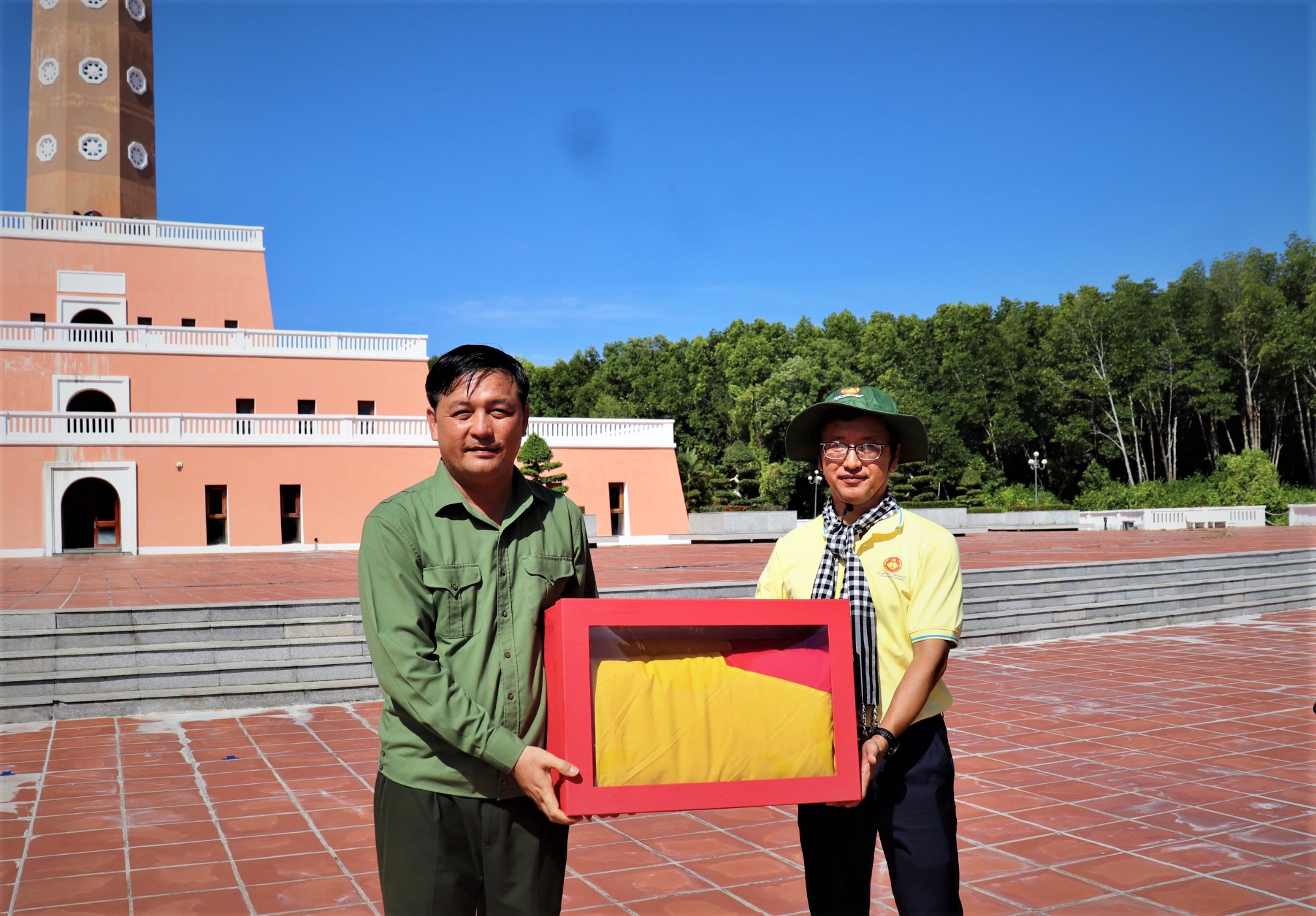 Ông Nguyễn Văn Sự, Giám đốc Ban Quản lý Khu du lịch Mũi Cà Mau tặng cờ cho Đoàn Ban Tuyên giáo và Dân vận Thành ủy TP Hồ Chí Minh