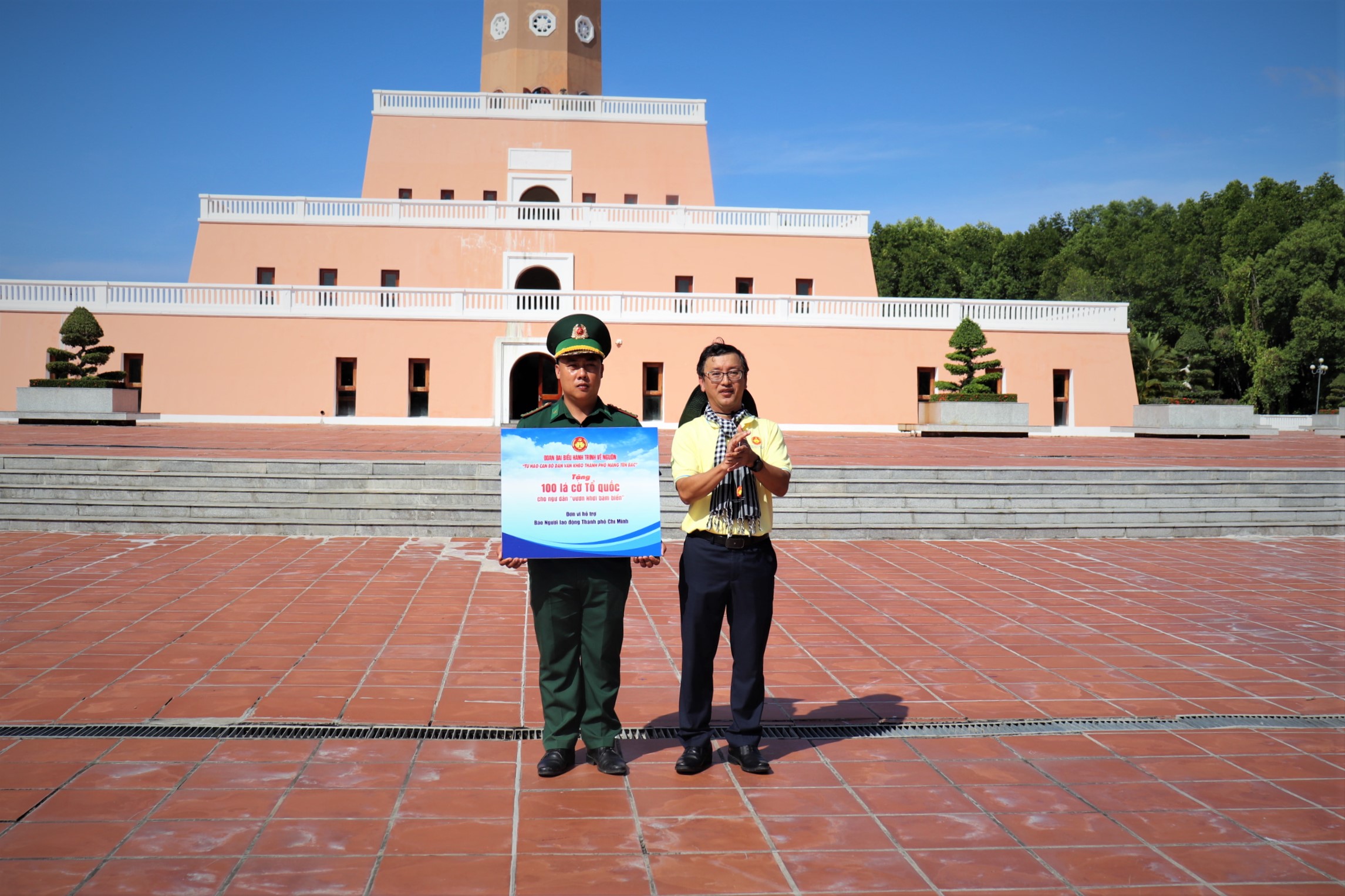 Đồng chí Tạ Quốc Trung, Phó Trưởng ban Tuyên giáo và Dân vận Thành ủy TP Hồ Chí Minh, trao bảng tượng trưng 200 lá cờ Tổ quốc cho ngư dân “vươn khơi bám biển”