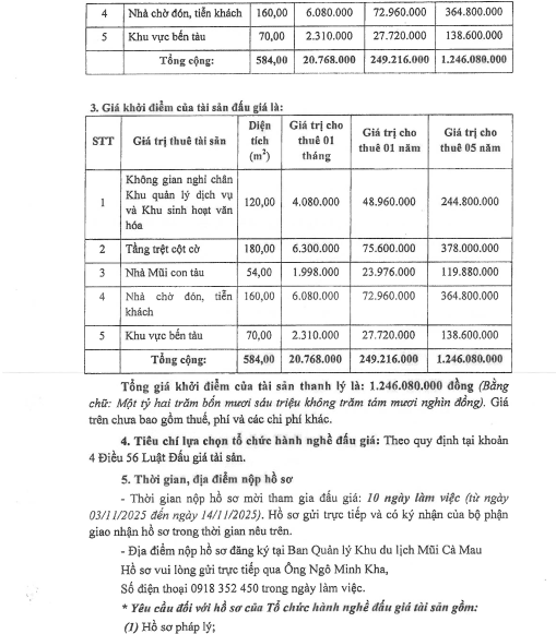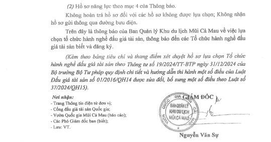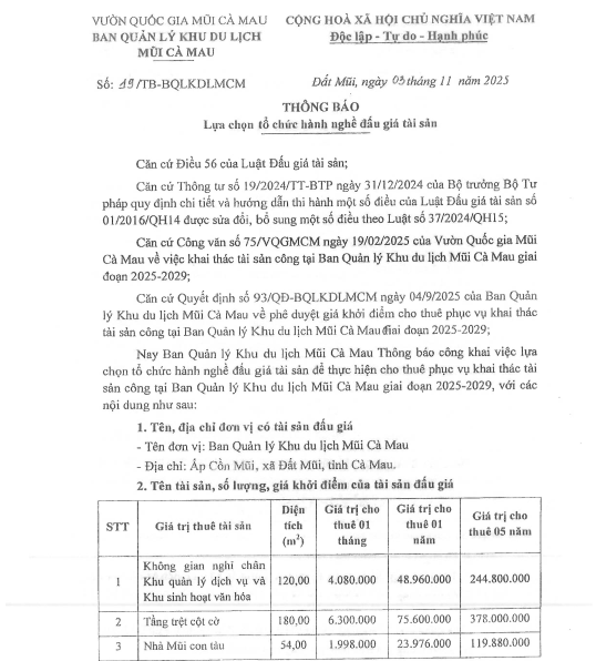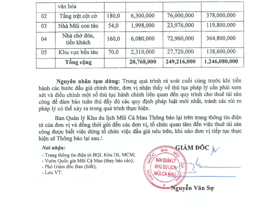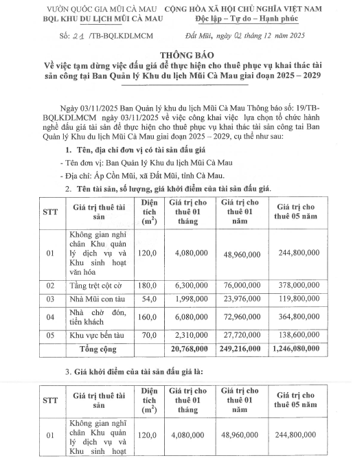 Thông báo về việc tạm dừng đấu giá để thực hiện cho thuê phục vụ khai thác tài sản công tại Ban Quản lý Khu du lịch Mũi Cà Mau giai đoạn 2025 – 2029